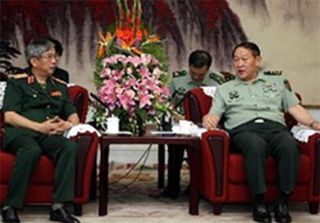 Bộ trưởng Quốc phòng Trung Quốc Lương Quang Liệt (phải) tiếp Thứ trưởng Bộ Quốc phòng Việt Nam Nguyễn Chí Vịnh. (Ảnh: THX/TTXVN)