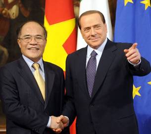 Thủ tướng Ý Silvio Berlusconi (phải) và Phó Thủ tướng VN Nguyễn Sinh Hùng (trái) tại Rome hôm 14 tháng 7 năm 2010. AFP PHOTO / Tiziana Fabi