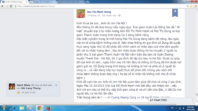 Ai mà có thể bỏ qua cơ chứ…Và rồi bất ngờ nhận thông tin về vụ chuyển trại đối với Mai Thị Dung và Đỗ thị Minh Hạnh từ trại Xuân Lộc Đồng Nai ra Hà Nội