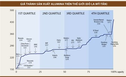 Cụ thể, từ hình minh họa về giá thành sản xuất alumina của thế giới, có thể thấy Việt Nam đang nằm ở nhóm có giá thành cao nhất (mỗi nhóm đại diện 25% sản lượng thế giới). Nói cách khác, chi phí sản xuất alumina ở Việt Nam đang rất cao so với mức trung bình của thế giới, nên TKV sẽ là một trong những nhà sản xuất phải đóng cửa trước tiên khi giá alumina thế giới trong tương lai tiếp tục ở mức thấp (giả thiết rằng Chính phủ không có ưu đãi, cứu trợ, hỗ trợ gì).