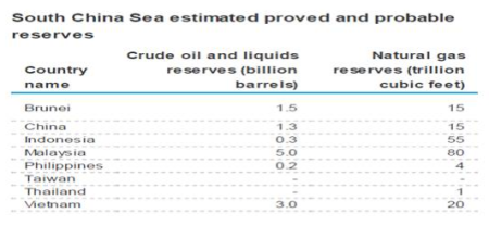 EIA cũng đưa ra bản thống kê chính thức trữ lượng dầu hỏa và khí đốt của các nước trong vùng Biển Đông như sau: