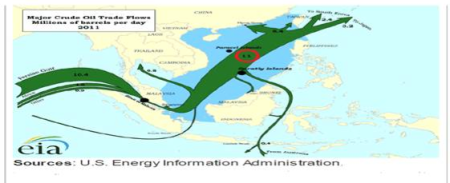 Quan trọng hơn hết, toàn bộ miền duyên hải phía Nam của Việt Nam, trong đó có quần đảo Trường Sa (Sparatly Islands) thuộc chủ quyền của Việt Nam nằm hoàn toàn trên tuyến đường chuyên chở dầu hỏa khắp cả vùng châu Á Thái Bình Dương, theo sự xác nhận của EIA với tổng số lên đến 11 triệu thùng một ngày vào năm 2011 được phân bố ra các quốc gia như bản đồ dưới đây: