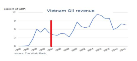 Căn cứ vào dữ kiện của World Bank, thì thu nhập về dầu hỏa của Việt Nam đang từ con số không vào năm 1986 đã lên đến gần 7 % tổng giá trị sản lượng quốc dân GDP vào năm 2012.