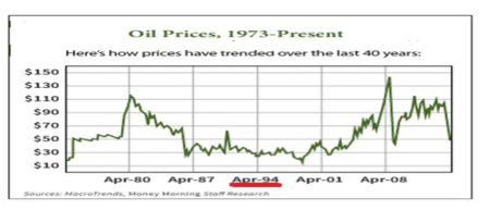 Biểu đồ 3: Biến chuyển giá dầu 1973-2015 (US dollars / barrel)