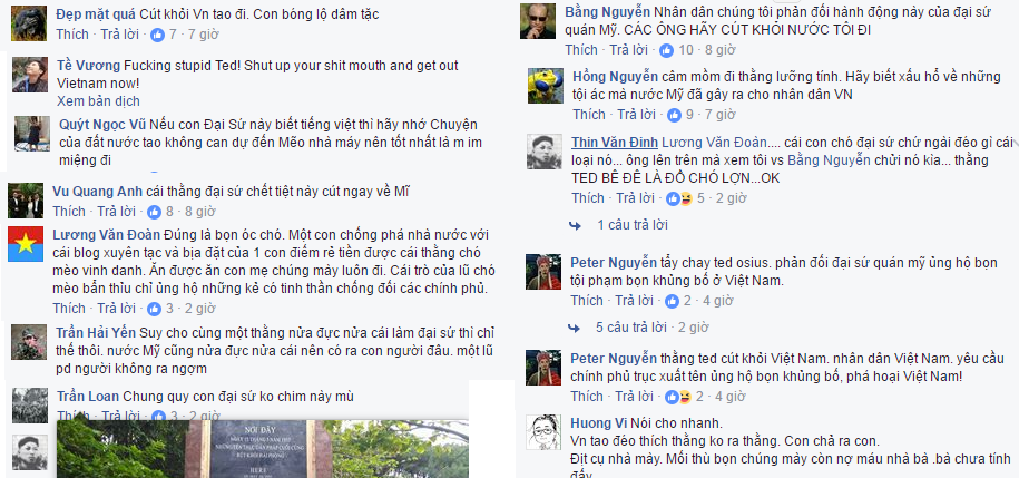 Cạnh đó, Facebooker thì đòi “tống cổ” Ngài Đại sứ ra khỏi Việt Nam. Như Facebooker Vu Quang Anh đòi “cái thằng đại sứ chết tiệt này cút ngay về Mĩ”. Còn facebooker Peter Nguyễn gọi Ngài đại sứ là “thằng ted”, và đòi Ngài đại sứ phải “cút khỏi Việt Nam”. Một Facebooker khác cực đoan hơn là Lương Văn Đoàn thì tìm cách xúc phạm người đăng tải thông tin lẫn người được vinh danh: “Đúng là bọn óc chó. Một con chống phá nhà nước với cái blog xuyên tạc và bịa đặt của 1 con điếm rẻ tiền được cái thằng chó mèo vinh danh. Ăn được ăn con mẹ chúng mày luôn đi”.