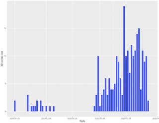 Số ca mỗi ngày (Biểu đồ 1) cho thấy dịch bộc phát từ ngày 23/1/2020, và đã trải qua 2 đợt. Đợt 1 xảy ra vào khoảng cuối tháng 1 và đầu tháng 2, với số ca lác đác. Đợt hai bắt đầu từ cuối tháng 2 và đầu tháng 3, với số ca tăng nhanh. Nhưng số ca nhìn chung không tuân theo một xu hướng có thể dự báo bằng mô hình dịch tễ học, vì sự trồi sụt khá bất thường. Tuy nhiên, trong thời gian gần đây thì số ca có xu hướng giảm.