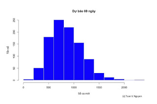 Các tham số trên (số ca bệnh, hệ số lây lan R0, và nhiễm lực) có thể dùng để dự báo số ca nhiễm trong tương lai. Phương pháp dự báo chủ yếu là ‘branching process’ [4], dựa vào giả định (i) số ca bệnh mỗi ngày tuân theo luật phân bố Poisson; và (ii) thời gian. Phương pháp phân tích xem mỗi số ca nhiễm là một tham số bất định chịu sự chi phối của luật xác suất. Kết quả dự báo (Biểu đồ 9) cho thấy trong 60 ngày tới, tổng số ca nhiễm mới có thể dao động trong khoảng 165 (tối thiểu) đến 2322 người (tối đa), với trung vị là 811 người. Tình huống tốt nhứt và xấu nhứt được trình bày trong Biểu đồ 10.