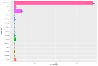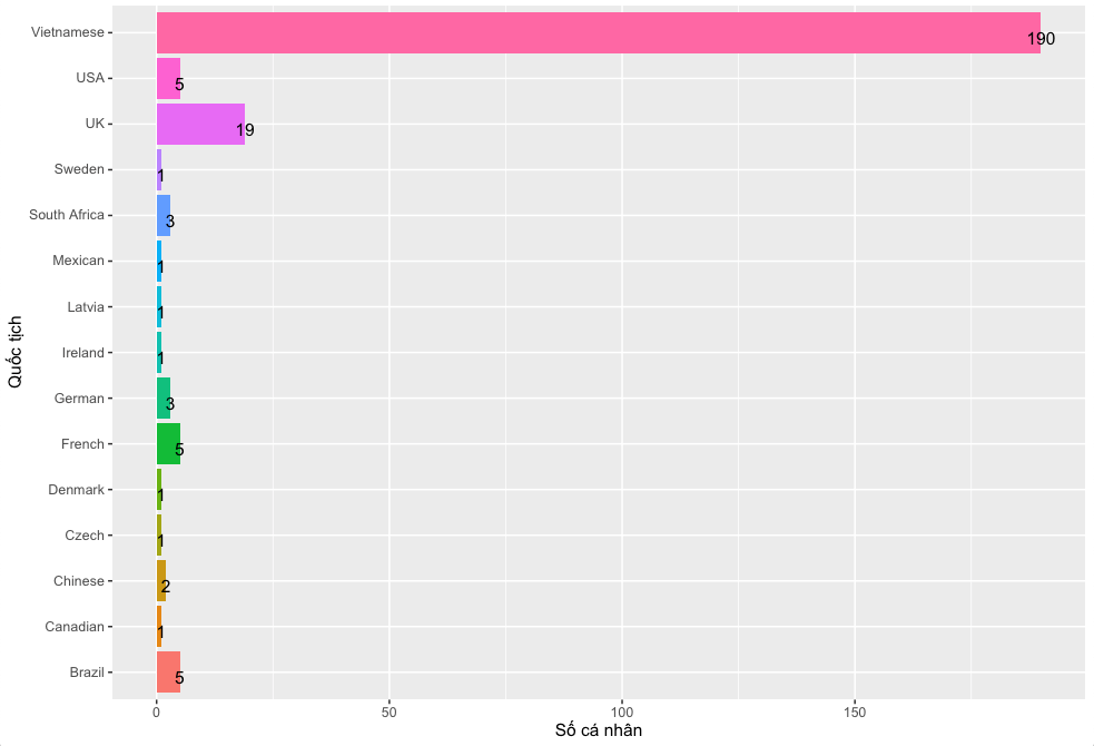 Gần 80% (n = 190) bệnh nhân là người mang quốc tịch Việt Nam. Nói cách khác, khoảng 20% là người mang quốc tịch nước ngoài. Người nước ngoài chủa yếu là Anh (chiếm gần 8% tổng số). Các quốc gia như Mĩ, Pháp, Ba Tây, mỗi nước ‘đóng góp’ 5 bệnh nhân cho Việt Nam. Nhưng các nước khác như Đức, Đan Mạch, Thụy Điển, Nam Phi, Ái Nhĩ Lan, Latvia, Tiệp, v.v. cũng có 1-3 bệnh nhân đang được điều trị ở Việt Nam (Biểu đồ 5).