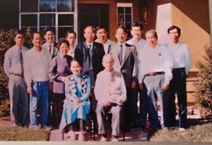 Hình 9: 1992, Tới thăm Giáo Sư Phạm Biểu Tâm, thành phố Tustin, Orange County, ngồi: Thầy Cô Phạm Biểu Tâm, đứng từ trái: Văn Kỳ Chương, Trần Trung Nhựt, Đặng Văn Việt, Cô Hoàng Tiến Bảo, [ ? ], Thầy Hoàng Tiến Bảo, Nguyễn Minh Quốc YK 74, BS Trần Quý Nhu, Lâm Kỳ Hiệp, [ ? ] , Nguyễn Cầm. [Trích album gia đình GS Phạm Biểu Tâm, ghi chú hình Nguyễn Cầm]