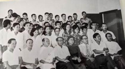 Hình 3: Hội đồng giám khảo và một phần trong số đông đảo 66 các tân nội trú khoá 1974 Đại học Y khoa Sài Gòn, hàng trước từ trái: BS Dương Minh Quảng (đại diện Bộ Y tế), GS Đặng Trần Hoàng, GS Đào Đức Hoành, GS Hoàng Tiến Bảo (Chủ tịch Hội đồng Giám khảo), GS Huỳnh Thị Xuân, GS Trần Văn Bảng, Giảng sư Hoàng Minh Mậu, Giảng sư Tăng Nhiếp.