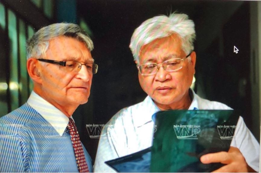 Hình 2: Người học trò cũ lâu năm của Thầy nay mái tóc cũng đã bạc phơ. Ngày chụp tấm hình này,Thầy Hoàng Tiến Bảo mất cũng đã 6 năm. Võ Văn Thành, nay đã là giáo sư Y khoa Sài Gòn, đang trao đổi với GS David Segal đến từ Israel về kết quả của một bệnh nhân sau cas mổ cột sống. [ photo by Nguyễn Luân, nguồn báo Ảnh Việt Nam 23.04.2014 ]