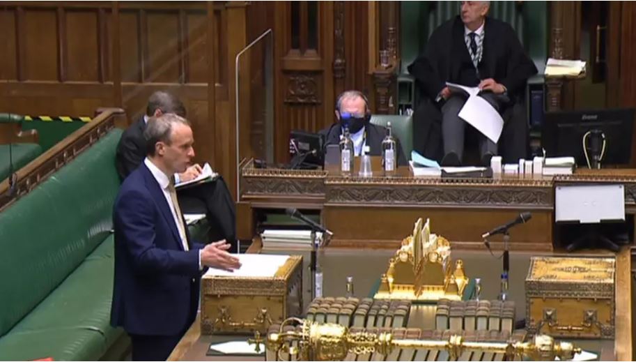Ngoại trưởng Dominic Raab trình bày trước Nghị viện Anh về vấn đề người Duy Ngô Nhĩ ở Trung Quốc, ngày 12/01/2021, Luân Đôn, Anh Quốc. © AFP