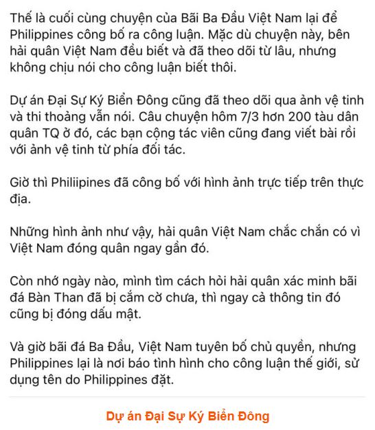 Bộ Quốc phòng Philippines hôm 21/3 lên tiếng yêu cầu Trung Quốc phải rút 220 tàu cá khỏi đá Ba Đầu thuộc cụm Sinh Tồn ở quần đảo Trường Sa, gọi việc các tàu cá Trung Quốc xuất hiện ồ ạt một lúc tại khu vực này là vi phạm các quyền trên biển. Reuters loan tin này hôm 21/3.